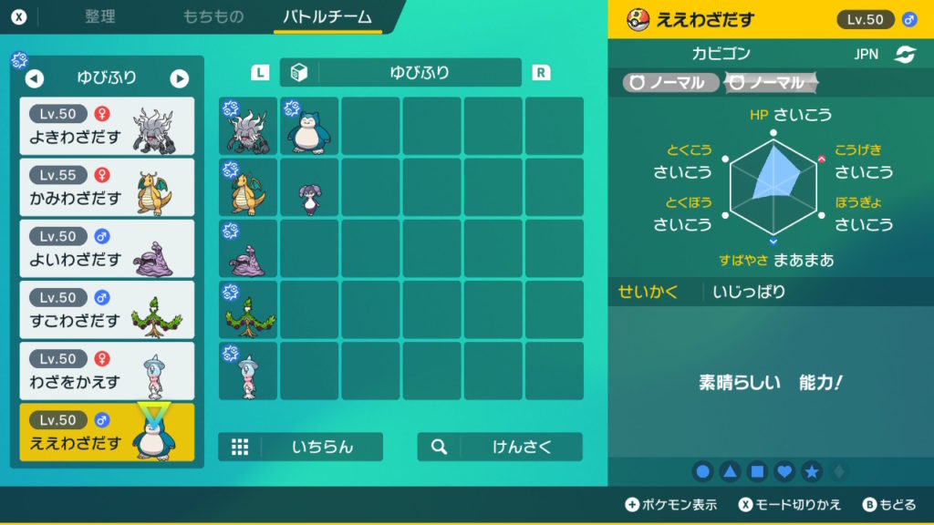 - パーティーは6匹登録可能 → 選出は1匹のみ